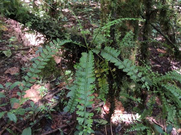 Epiphytes are sometimes called "air plants" a reference to their habit of growing not in the soil, but rather anchored to other plants, normally trees, higher in the canopy of the forest where there is more light, but also less water. Special adaptations include tough, anchoring roots or rhizomes to hold fast onto bark and to accumulate some detritus. Epiphytes are also adapted to occasional water scarcity, but are also normally restricted to habitats with higher rainfall and/or humidity. Yet another important adaptation addresses the scarcity or nutrients necessary for plant growth such as phosphorous and nitrogen which would normally be obtained from the soil. This species can form new plants can form when the ends of the long fronds take root.