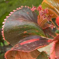 Red and green leaves are broadly elyptical and have rounded teeth along margin. Showy foliage plant in gardens. |