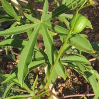 Partly succulent plant of dry rocky slopes. Palmate leaves have about 7 narrow divisions. |