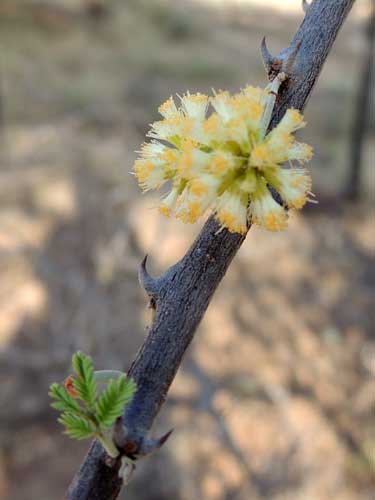 FLOWERS: Spherical heads of small white flowers and yellow stamens. Fabaceae -- Bean Family -- Mimosoideae - Mimosa Sub-FamilyMore Information: |