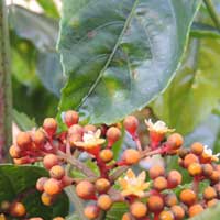 Shrub with glossy-green, compound leaves. Flowers orange and arranged in capitate panicles. |