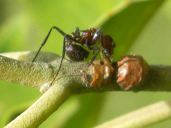 ![]() These golden brown scales are adhered to a twig of a Muhutu Tree, (Terminalia brownii). Both scales appear to have been parasitized, probably by a minute wasp. Kitale, Kenya, March 2011. A myrmicine ant, possibly Myrmicaria is investigating. |