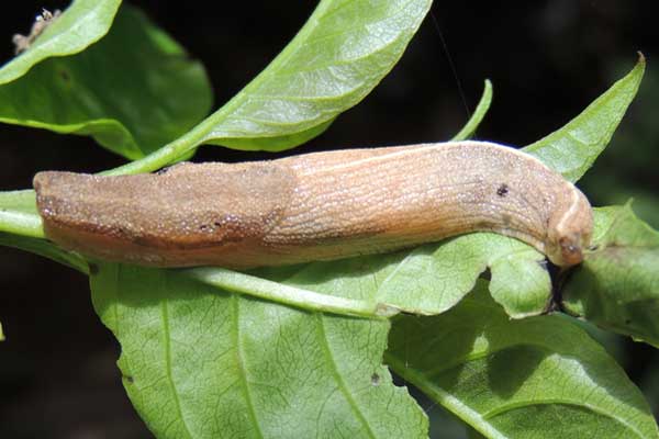Land snails lacking shells are known as slugs. There are several families of snail that include species without shells. Like typical land snails they move along on a layer of mucus secreted by their 'stomach-foot'. This is the reason for the order name 'Gastropoda'. This restricts slug activity to times when the relative humidity is high. In moist cloud forests slugs and snails can forage by day, but in other environments they must come out of underground hiding only at night or during rain events. ![]() Observed at Kitale, Kenya, Africa. April 2013. I am uncertain if this is a separate species from the one shown at left. Urocyclidae -- Tailed Land Snail FamilyMore Information: |