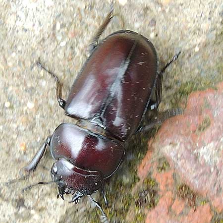Stag beetle grubs must develop in a rotting log or root crown and so their biodiversity would be adversely impacted by people gathering dead wood from a forest ecosystem preserve. Males have hugely enlarged mandibles, but females' are small. Lucanidae -- Stag Beetle FamilyMore Information: |