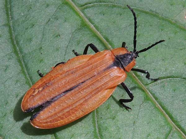 Net-winged Beetles, f. Lycidae, are easily recognizable to family by the unique wings. The first wing pair, the elytra, are leathery instead of the usual shell-like texture of most beetles. These wings sport an intricate patterns of cross veins and very often unique patterns of red, yellow, black and orange colors. Net-winged Beetles fly and crawl languidly, apparently little concerned about predation by birds or other insectivores. Toxic compounds in their hemolymph are likely. Lycidae -- Net-winged Beetle FamilyMore Information: |